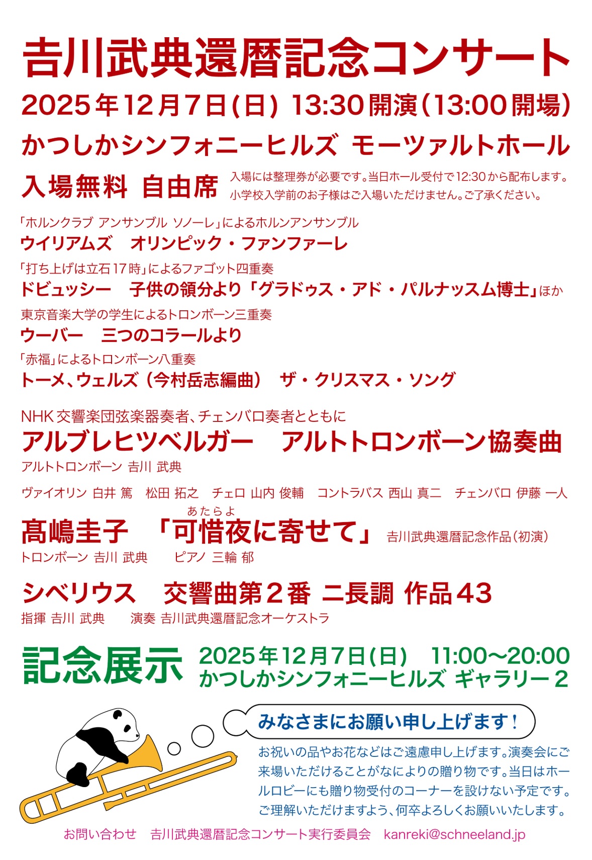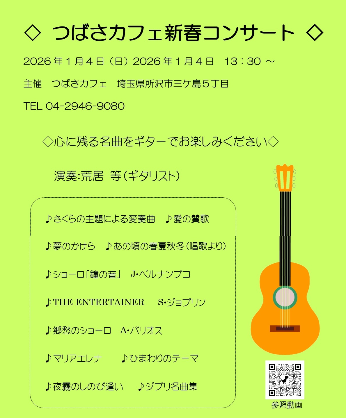 ☆ Live・Event & Ticket ☆ 注目のコンサート情報をご紹介します。 週末のお出かけやご予定の参考に、ぜひご覧ください。 - - - - - - - - - - - - - - - - - - - - - - - - - - - - - - - - - - - - - - - - - - - - - - - - - - - - 吉川武典還暦記念コンサート 2025年12月07日(日)13:30開演 かつしかシンフォニーヒルズ モーツァルトホール(東京都) ![]() アルブレヒツベルガー アルトトロンボーン協奏曲 NHK交響楽団弦楽器奏者、チェンバロ奏者とともに アルトトロンボーン 吉川 武典 ヴァイオリン 白井 篤 松田 拓之 チェロ 山内 俊輔 コントラバス 西山 真二 チェンバロ 伊藤 一人 嶋圭子 「可惜夜に寄せて」 吉川武典還暦記念作品(初演) トロンボーン 吉川 武典 ピアノ 三輪 郁 シベリウス 交響曲第2番 ニ長調 作品43 指揮 吉川 武典 演奏 吉川武典還暦記念オーケストラ 「ホルンクラブ アンサンブル ソノーレ」によるホルンアンサンブル ウイリアムズ オリンピック・ファンファーレ 「打ち上げは立石17時」によるファゴット四重奏 ドビュッシー 子供の領分より 「グラドゥス・アド・パルナッスム博士」ほか 東京音楽大学の学生によるトロンボーン三重奏 ウーバー 三つのコラールより 「赤福」によるトロンボーン八重奏 トーメ、ウェルズ (今村岳志編曲) ザ・クリスマス・ソング - - - - - - - - - - - - - - - - - - - - - - - - - - - - - - - - - - - - - - - - - - - - - - - - - - - - CIEL東京室内楽団 定期公演vol.16 管弦9重奏による豊潤の色彩美 2025年12月09日(火)日本福音ルーテル東京教会(東京都) 19:00開演 ![]() 美しいステンドグラスと豊かな響きのする教会で織りなす珠玉の室内楽。 名曲ブラームス「セレナーデNo.1」(9重奏版)、マルティヌー「9重奏曲 第2番」 が個々の楽器の対話を鮮やかに描き出します。 管楽器と弦楽器が織り成すハーモニーの妙を、熟練の演奏家たちが一体となってお届 けするコンサートです。 プログラム セレナーデ No.1 ブラームス 9重奏曲 第2番 マルティヌー Wind Quartet フランセ チェコの作曲家マルティヌーによる、9重奏曲第2番( ブラームスによる名曲「セレナーデ第1番」 フランスのエスプリが光るフランセによる4重奏曲 - - - - - - - - - - - - - - - - - - - - - - - - - - - - - - - - - - - - - - - - - - - - - - - - - - - - オーケストラ・チェルカトーリ 第6回演奏会 2025年12月14日(日) 14:45 開演 横浜みなとみらいホール 大ホール(神奈川県) ![]() 音が国境を越え、文化が溶け合う。マーチ、ラテン、ジャズ、そしてクラシック。 異なる音楽が出会い、交わり、ひとつの物語を紡ぐとき、それはまさに“アメリカ音楽”となる。 異国の街をさすらう旅人、アスファルトに跳ねるジャズの鼓動、熱帯の舞踏、祝祭の星条旗。 今まさに、時代と文化を越えた音たちが自由に響き合い、空間を揺らしている。 ジャンルや伝統の枠を軽やかに飛び越える、しなやかな響き。その多様性こそが、アメリカという 名の音楽の本質です。 交錯する音が熱を帯び、渦となって立ち上るその只中へ、どうぞ心を預けてみてください。 新しいステージへと踏み出すチェルカトーリの第6回演奏会。 みなとみらいホールで、皆さまをお待ちしております。 - - - - - - - - - - - - - - - - - - - - - - - - - - - - - - - - - - - - - - - - - - - - - - - - - - - - つばさカフェ新春コンサート 2026年1月4日(日)13:30 開演 ![]() つばさカフェ 〒359-1164 埼玉県所沢市三ヶ島5-541-43 問い合わせ つばさカフェホームページ TEL:04-2946-9080 出演:荒居等(ギタリスト)「さくら」の主題による変奏曲 「夢のかけら」仮面ライダー555 op. 郷愁のショーロ〔A・バリオス〕 マリアエレナ THE ENTERTAINER ジブリメドレー 他 湖畔サロンコンサート:おかげさまでご好評を頂きました。ありがとうございました。 どっぽ サロンコンサート 盛況のうちに終了しました。ご協力下さった皆様ありがとうございました。 ◇次回に向けてリクエストなどあればお寄せください。→ お問合せ:喫茶「どっぽ」 東大和市 南街 1-19-5 TEL 042-565-5182 ぎたろー演奏動画 ■楽市楽座からのお知らせ キリコと長山の二人旅、二人芝居。北は北海道から南は沖縄まで、野外劇の魅力を伝えます! ※入場無料・投げ銭 全席自由 雨天のみ客席に竹骨テントを設置 野外劇団 楽市楽座 ◇16周年旅公演「みちばたの花」 2025年5月〜11月 ![]() ★来年度の劇団員1名を募集中。 新人を募集します!全国を一緒に芝居で旅してみたい人、連絡下さい! 体力と根性のある人、一年をおかしな2人とやりきれる人格者、冒険者。 住み込み可。応募、問合せは劇団メールにどうぞ。 拠点の大阪、十三、あるいは旅先で芝居を見て、会い、話し合える人。 未成年者、学生は劇団で責任をおえないため、保護者との相談、同意が必須です。 ◇野外劇団楽市楽座★2010年から9歳の娘を連れて家族三人で野外劇の全国行脚を開始。 2019年に娘が結婚して家族四人の旅に。やがて成長した娘夫婦は退団し自立。 2022年より夫婦劇団に。そんなこんなで、毎年5月から11月まで、北は北海道から南は沖縄まで、 全国各地を駆け巡り16年目を迎える。芝居は